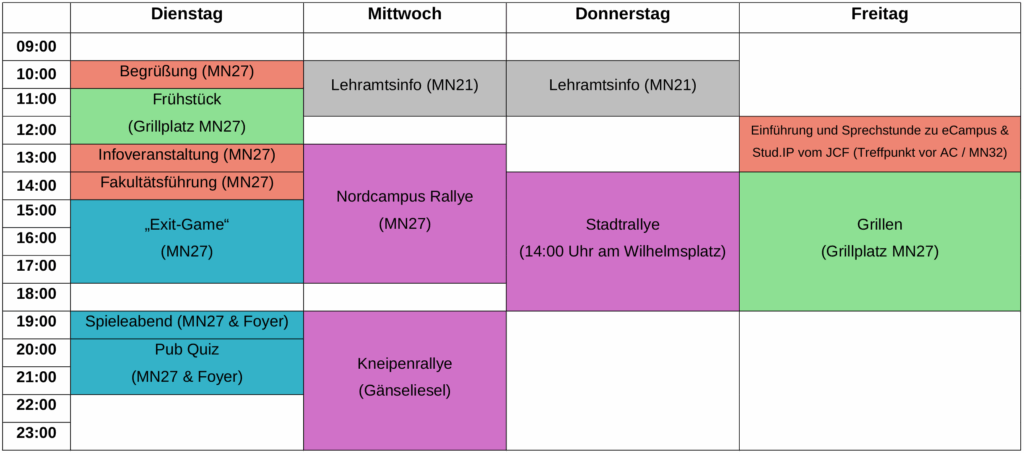 Alle Studierenden, die im Oktober für ihr Masterstudium neu zu uns nach Göttingen kommen, sind natürlich auch herzlich willkommen zu manchen O-Phasen-Veranstaltungen. Besonders die Fakultätsführung am Dienstag ist sicherlich interessant für euch, sowie zur Kneipenrallye und zum Spieleabend und Pub Quiz seid ihr herzlich eingeladen! Die restlichen Veranstaltungen konzentrieren sich auf die Bachelor-Erstis.